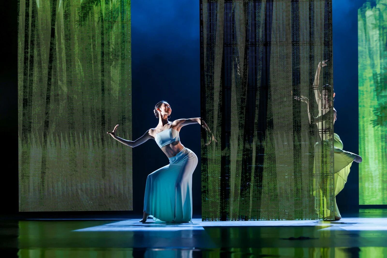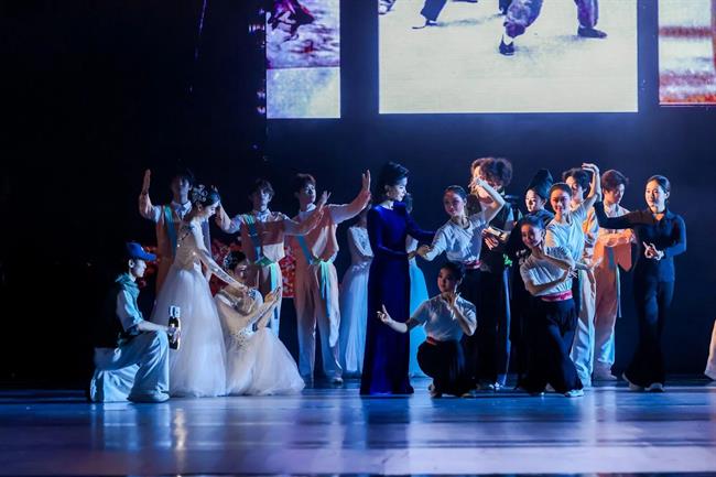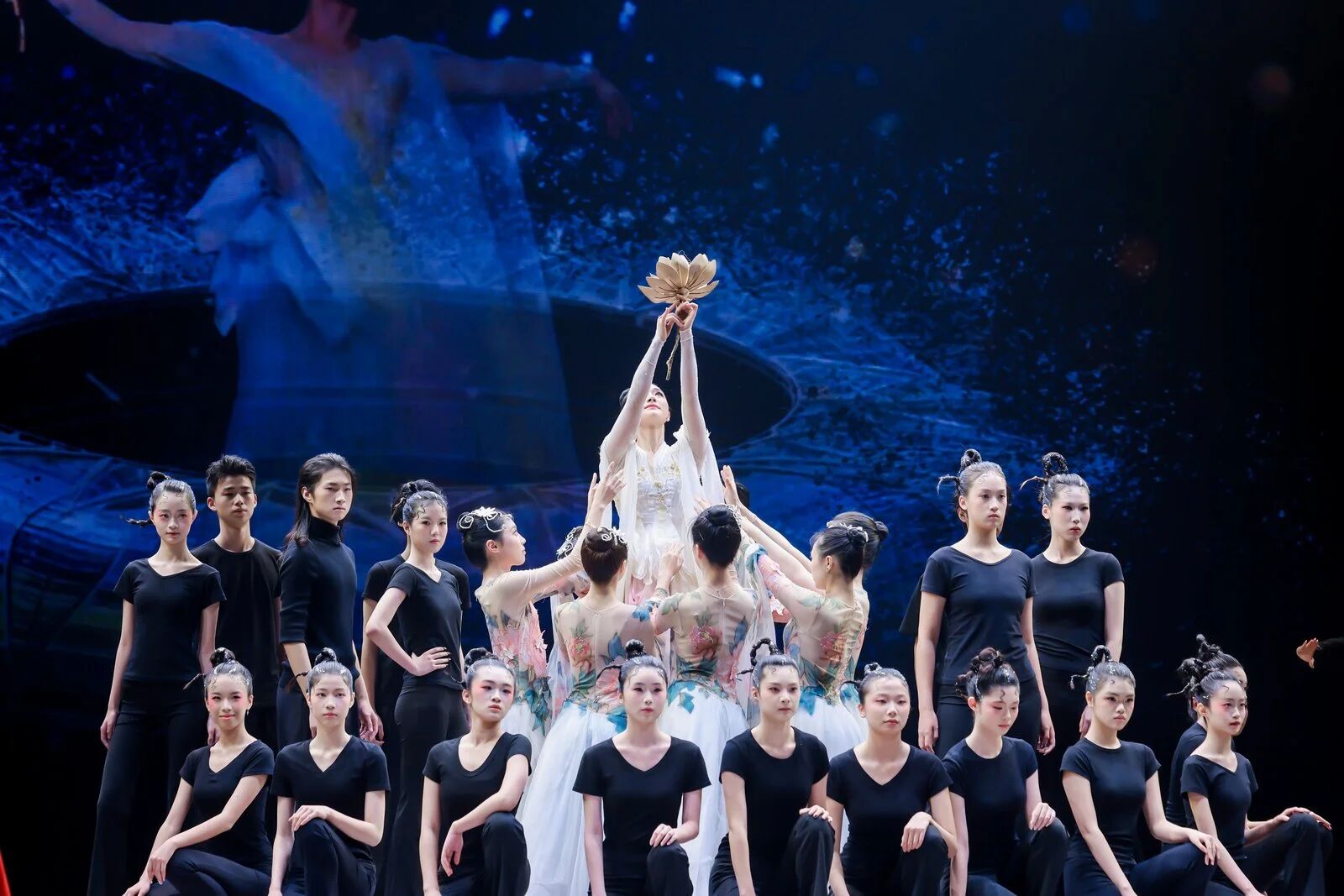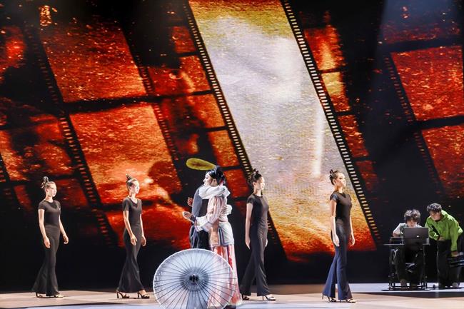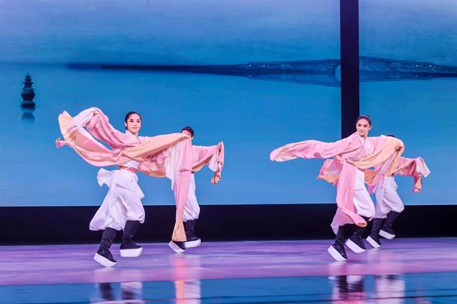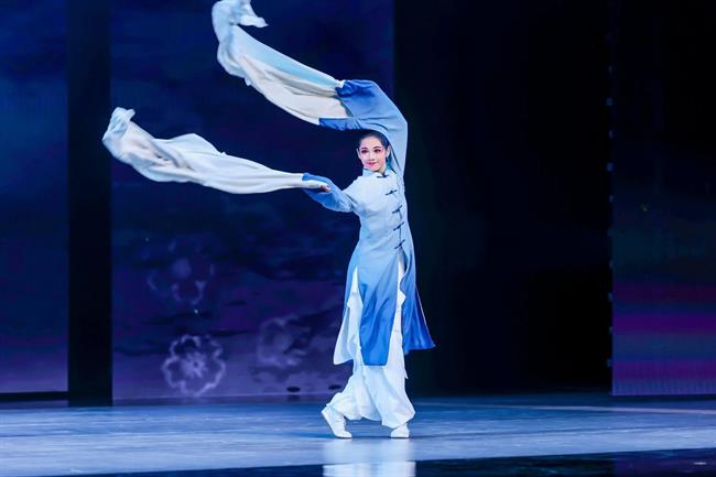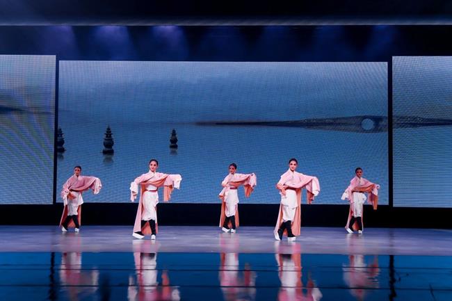 “未來廣度”篇章,燈光驟變,科技感與未來感撲面而來。杰出校友、青年舞蹈家徐夢(mèng)迪與舞蹈學(xué)院教師譚雨旋、楊博文攜學(xué)生重現(xiàn)了中國(guó)舞蹈最高獎(jiǎng)“荷花獎(jiǎng)”作品《西施別越》,其精妙的編排與動(dòng)人的張力,盡顯古典舞的現(xiàn)代審美。