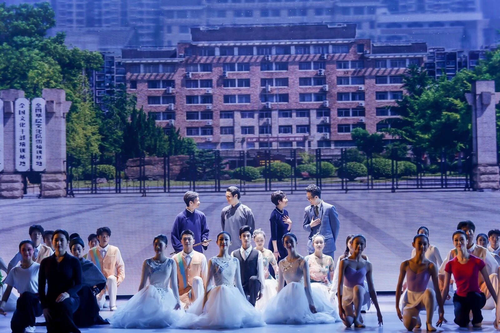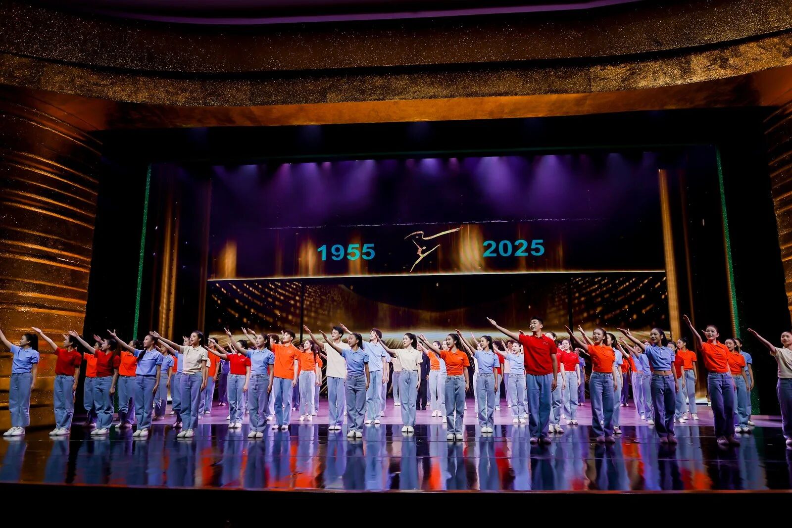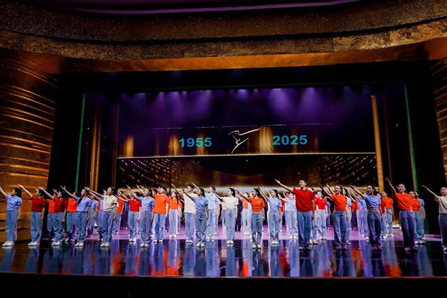 當(dāng)全場(chǎng)響起溫馨的《生日快樂》歌聲,晚會(huì)序幕《夢(mèng)想開始的地方》緩緩拉開。鐘聲悠揚(yáng),舞臺(tái)光影流轉(zhuǎn)間,時(shí)空仿佛被瞬間拉回1955年的黃龍洞畔。黃源、姚水娟、蓋叫天、趙松庭等4位浙藝前輩名師的原型化身緩緩浮現(xiàn),當(dāng)年教室里傳出的句句真言娓娓道來:“這所學(xué)校,應(yīng)該是新文化、新藝術(shù)的搖籃。”“傳真藝,做真人”“臺(tái)上站如松、行如風(fēng),不只是功夫,更是品性。”“希望同學(xué)們能沉得下心,為藝術(shù)百折不撓。”……一句句質(zhì)樸而深刻的囑托,穿越時(shí)空,在劇場(chǎng)內(nèi)回蕩。這不僅是對(duì)初心的回望,更是為浙藝70載“薪火相傳、弦歌不輟”的文化根基,注入了最深情的注腳。