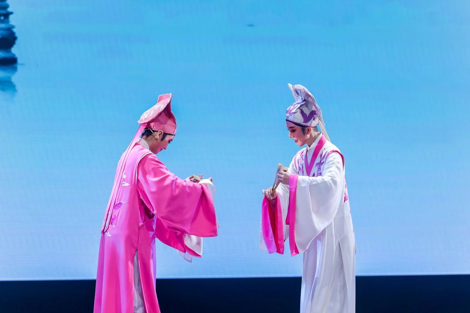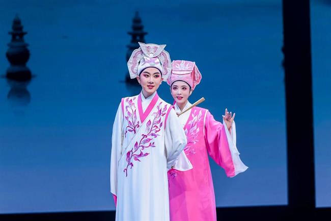 由優(yōu)秀校友鄭佳艷、李云霄、張亞洲、倪潤(rùn)志等與戲曲學(xué)院學(xué)子帶來的綜合表演《代代相傳》,以京劇、越劇、昆劇等多劇種的串燒演繹,生動(dòng)展現(xiàn)了戲曲藝術(shù)在師徒相傳間的生生不息。李云霄、張亞洲作為越劇“小百花”新生代代表,一同為觀眾精彩演繹了越劇《梁祝》中的經(jīng)典唱段《十八相送》。