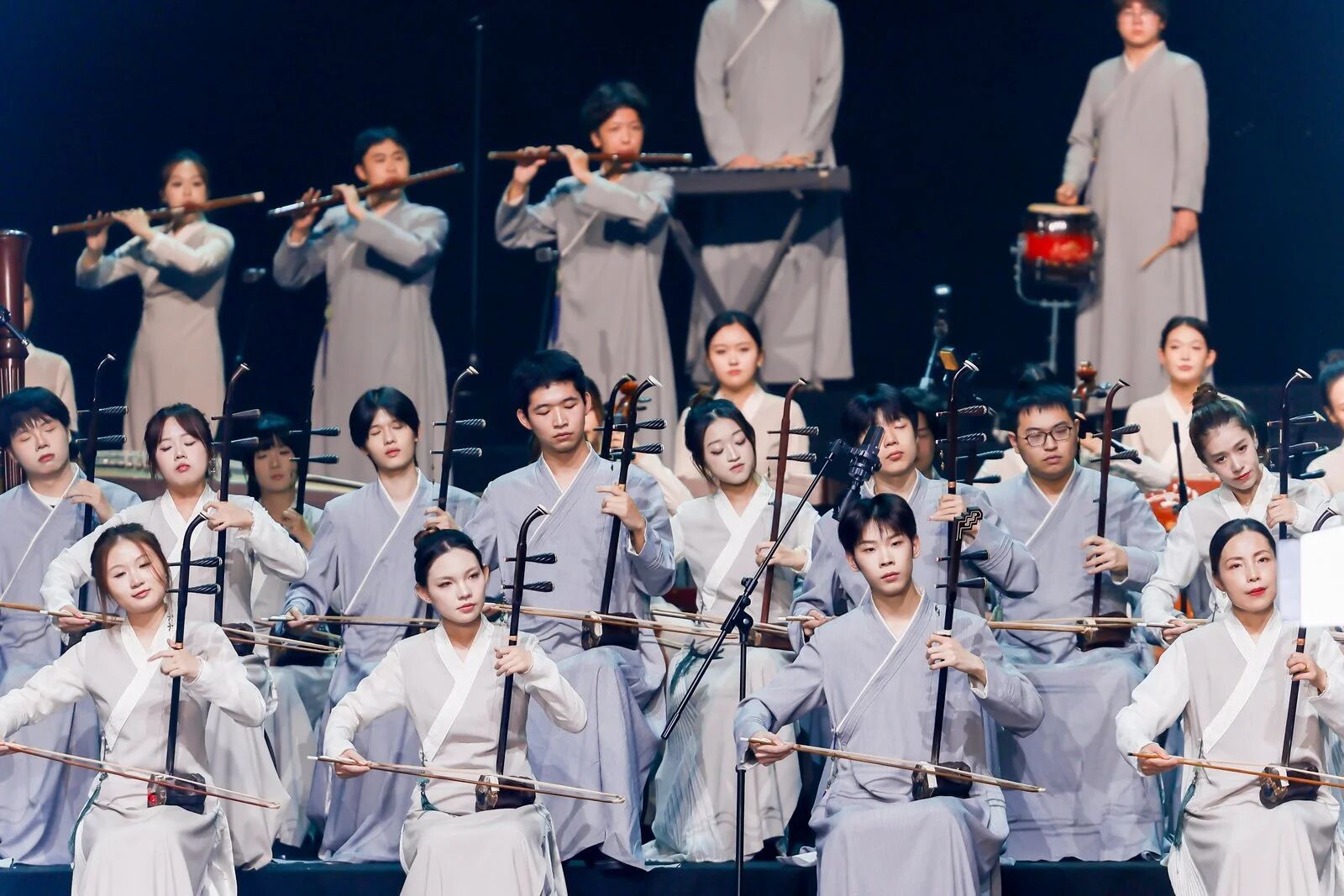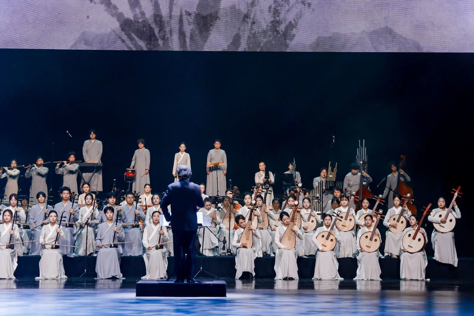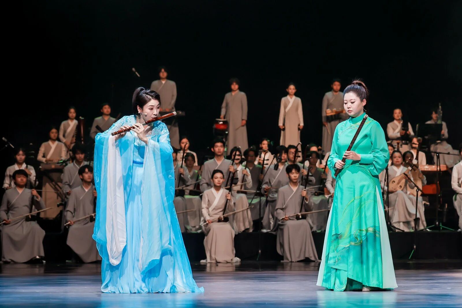 “育人深度”篇章,將目光聚焦于學(xué)校深厚的文化積淀。當(dāng)主持人深情回顧“浙派笛藝”創(chuàng)始人趙松庭先生的藝術(shù)人生時(shí),劇場(chǎng)內(nèi)一片靜謐。趙先生代表作《幽蘭逢春》由“浙派笛藝”第三代傳人——青年演奏家常軼偉、韓慧慧演奏,在中國(guó)廣播民族樂團(tuán)常任指揮張列先生的執(zhí)棒下,與音樂學(xué)院民族管弦樂團(tuán)共同奏響這經(jīng)典旋律。笛音裊裊,既是致敬,更是傳承的回響。