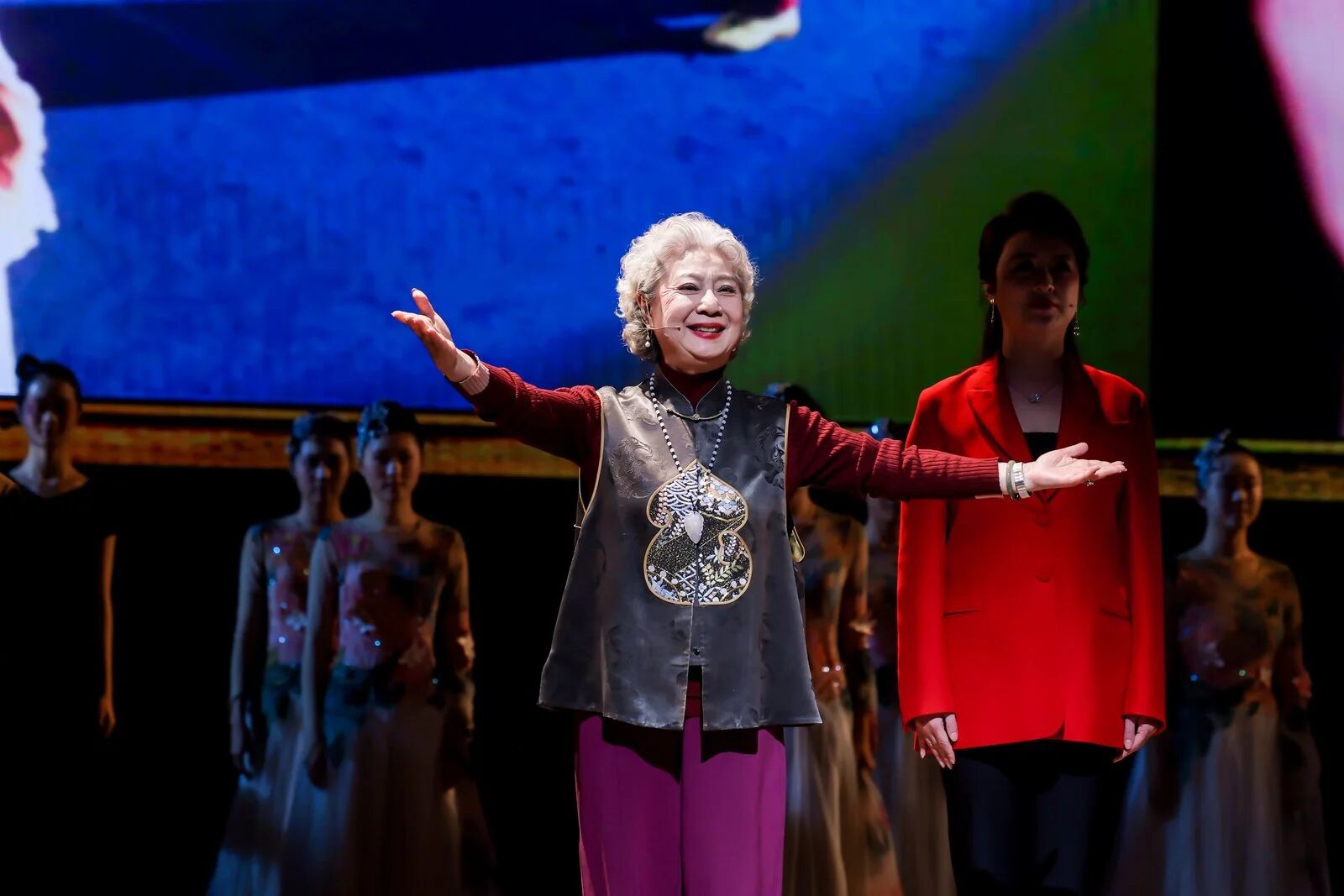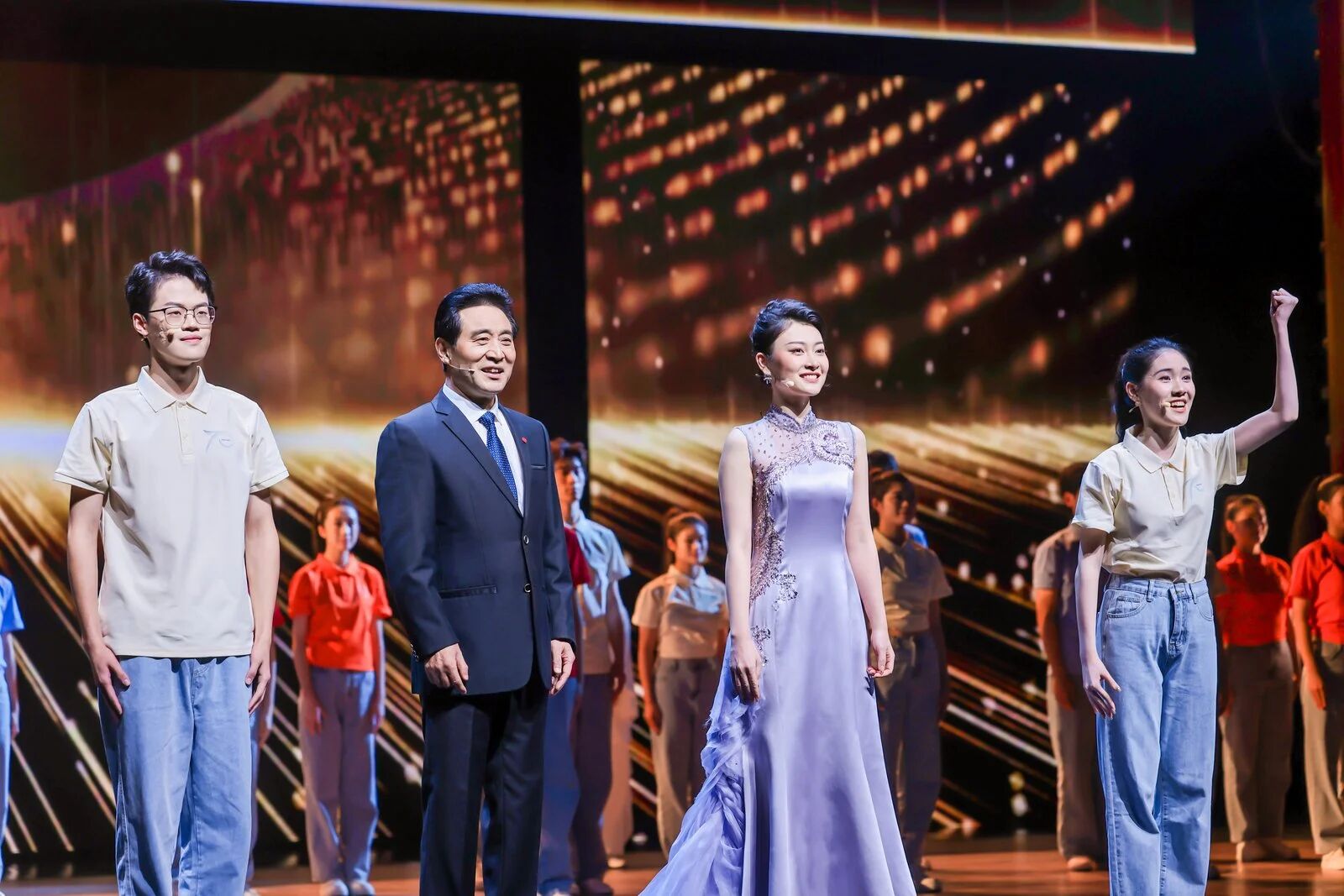 量身訂制的合唱歌曲《因?yàn)橛心恪窞檫@場(chǎng)晚會(huì)畫上了圓滿句號(hào)。夏振凱、陳臻、吳曉芳、韓紫娟與學(xué)生們的歌聲交織,舞臺(tái)背景上,記錄70年流金歲月的歷史影像緩緩流淌。光影、歌聲、回憶與感動(dòng)在此刻交融,溫暖了在場(chǎng)的每一個(gè)人。