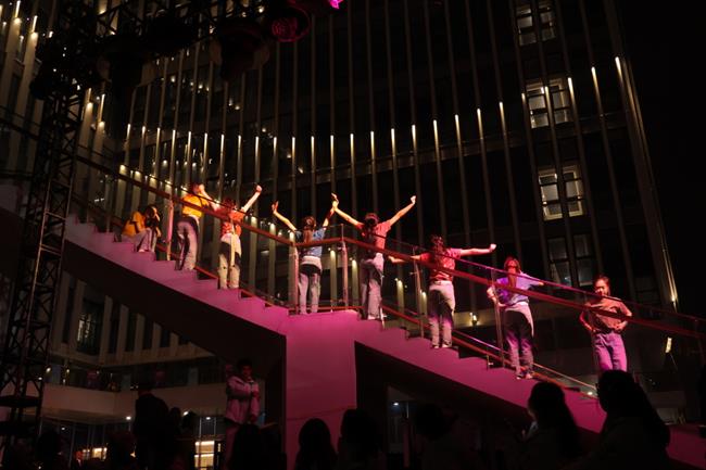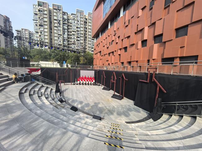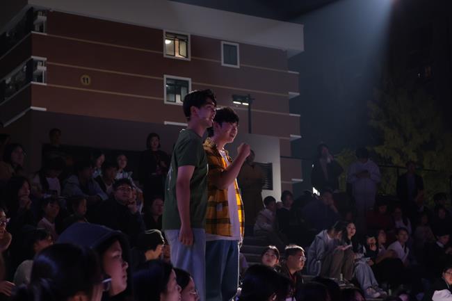 綜合教學(xué)樓前的"云階劇場",成了22級表演藝術(shù)(五年一貫制)班學(xué)生的“移動課堂”——《永不NG的青春》在這里上演,沒有固定舞臺、沒有觀演隔閡,演員隨光影穿梭于觀眾之間,劇情在臺階、廣場等實景里自然鋪展。